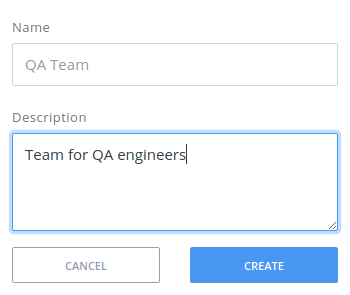 To create a new team, click the user icon (top right corner) and select Team Management. In the Team Management view, click Create Team. Enter a team name into the Name field and (optionally) a team description into the Description field, and then click the Create button.