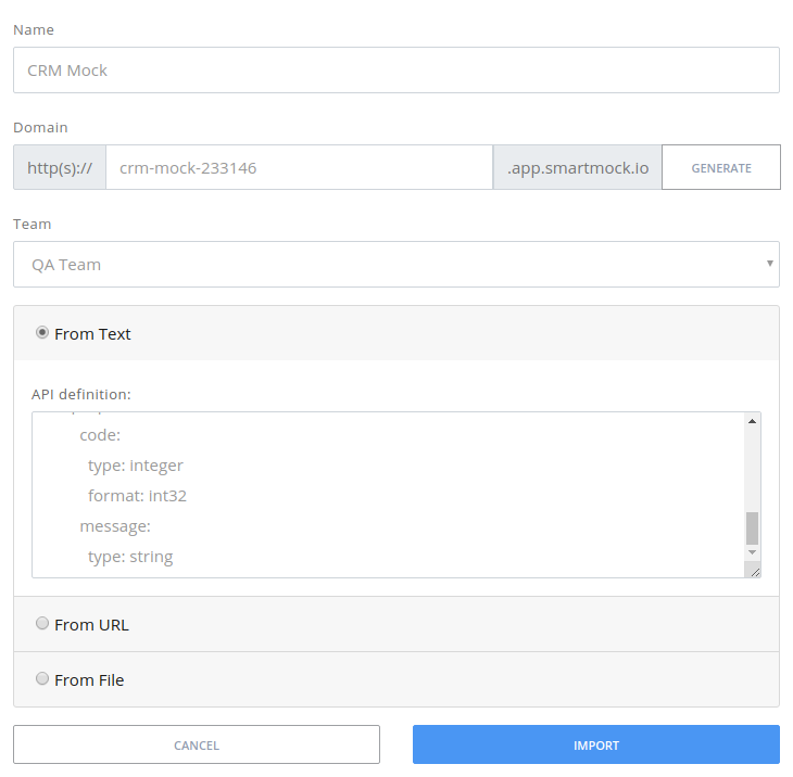 - Choose how you would like to import the workspace -- Select From Text if you want to paste the document content. The maximum document size is 200KB. -- Select From URL if you'd like to point to a URL that contains the document. -- Select From File if you'd like to upload a document. The maximum document size is 5MB.